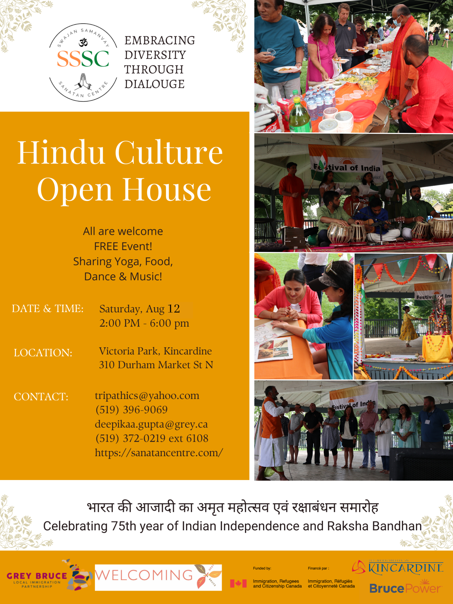 This is realized through weekly, monthly and annual activities, which include: The Kincardine Multicultural Festivals; Social and Religious Festivals; Environmental Clean-up; Yoga Day; volunteering with local social & charitable orgnanizations; activities that enhance the education of our children, and regular spiritual meetings (Satsang) that include meditation and yoga.
